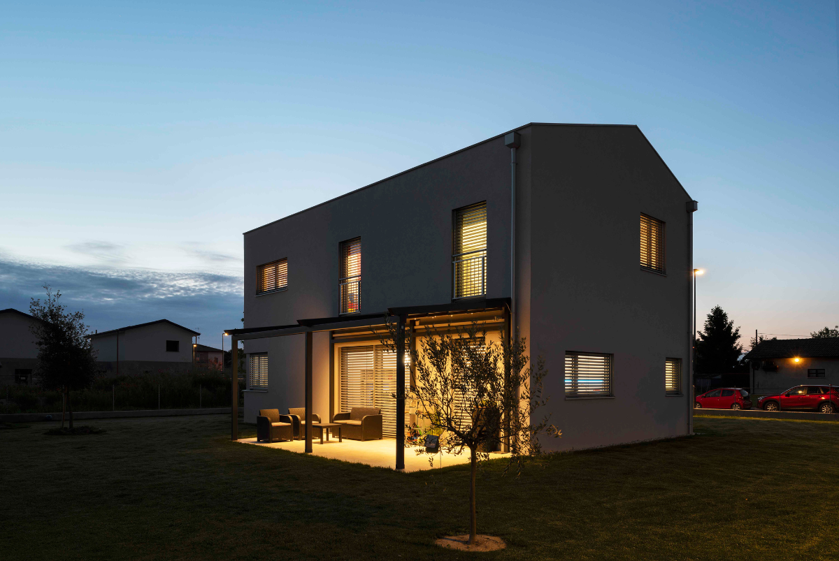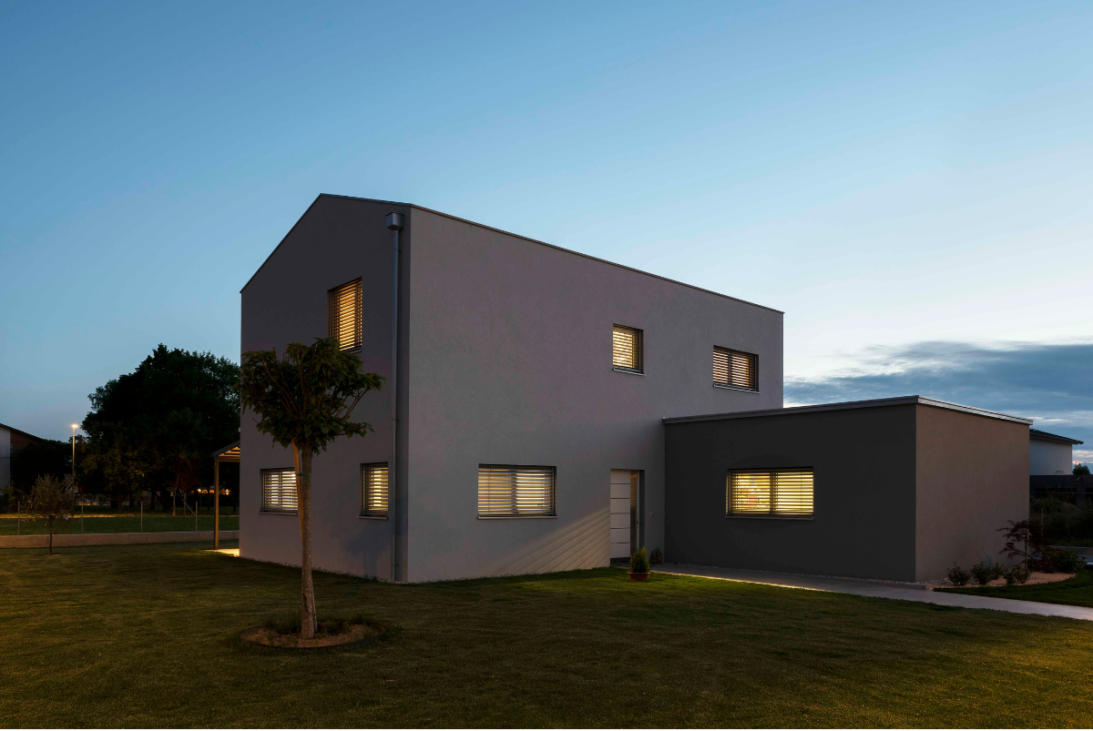 Dal punto di vista architettonico è la funzionalità a farla da padrona; Casa M è un edificio scatolare con tetto privo di sporti e cornicione, finestre ampie con schermatura solare integrata e pergolato posto a sud, dove la casa si apre verso il giardino offrendo continuità al living.