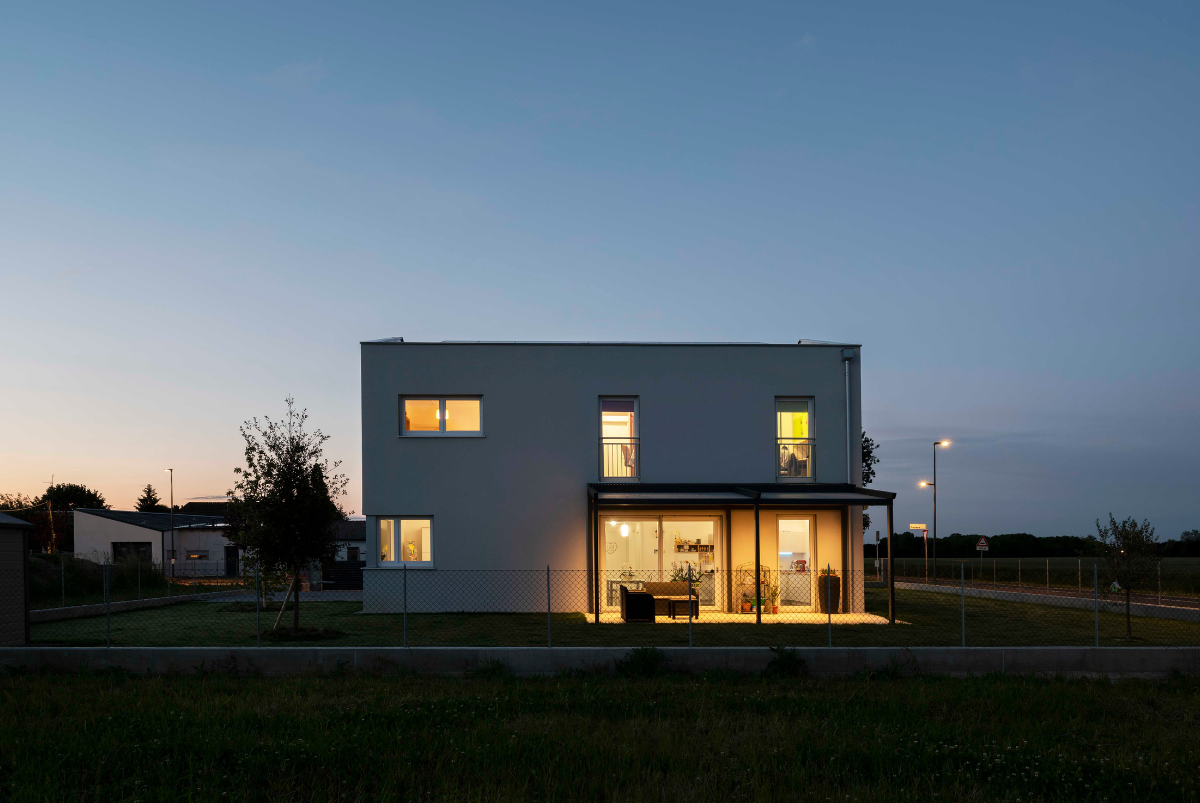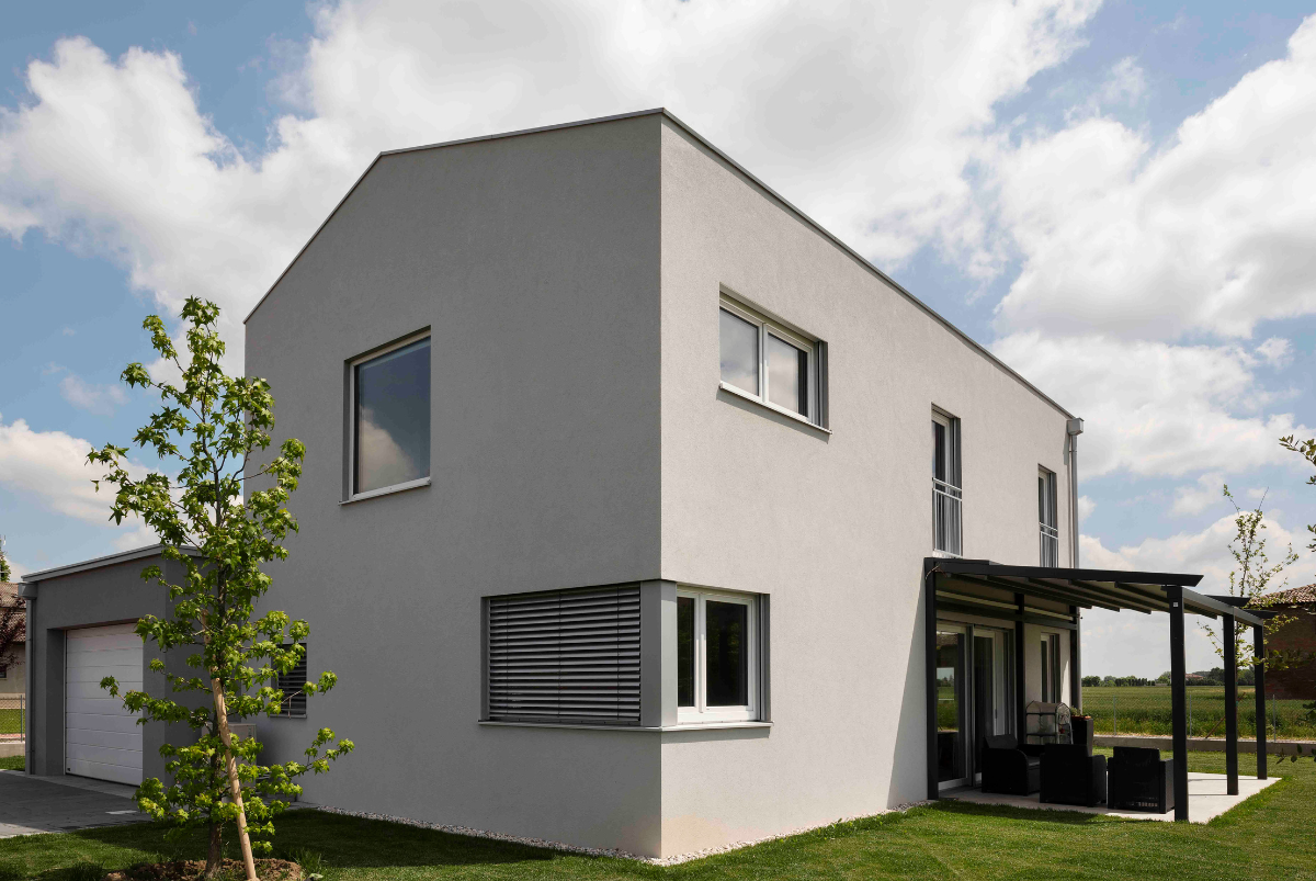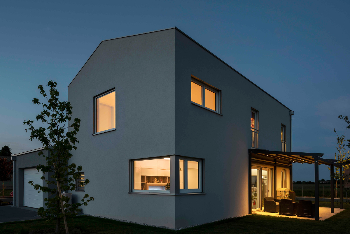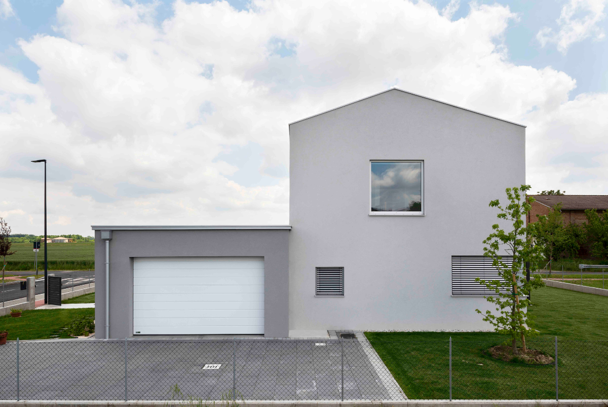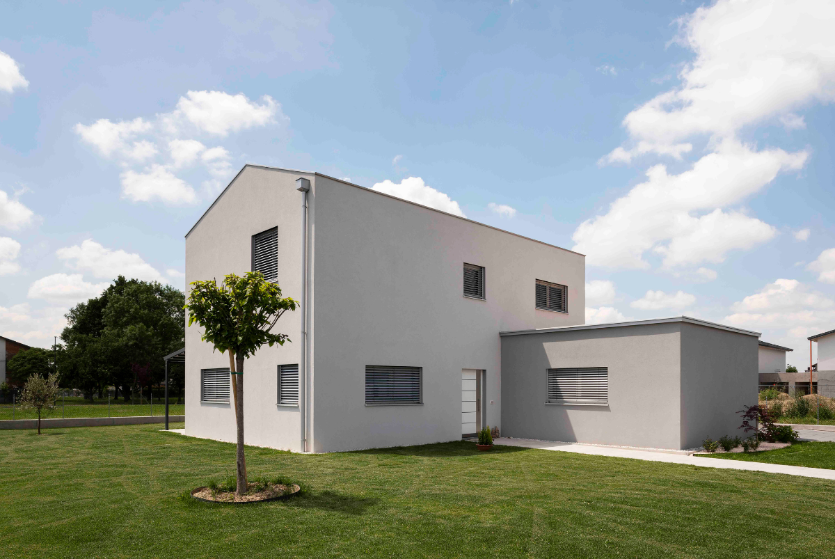 Dal punto di vista architettonico è la funzionalità a farla da padrona; Casa M è un edificio scatolare con tetto privo di sporti e cornicione, finestre ampie con schermatura solare integrata e pergolato posto a sud, dove la casa si apre verso il giardino offrendo continuità al living.